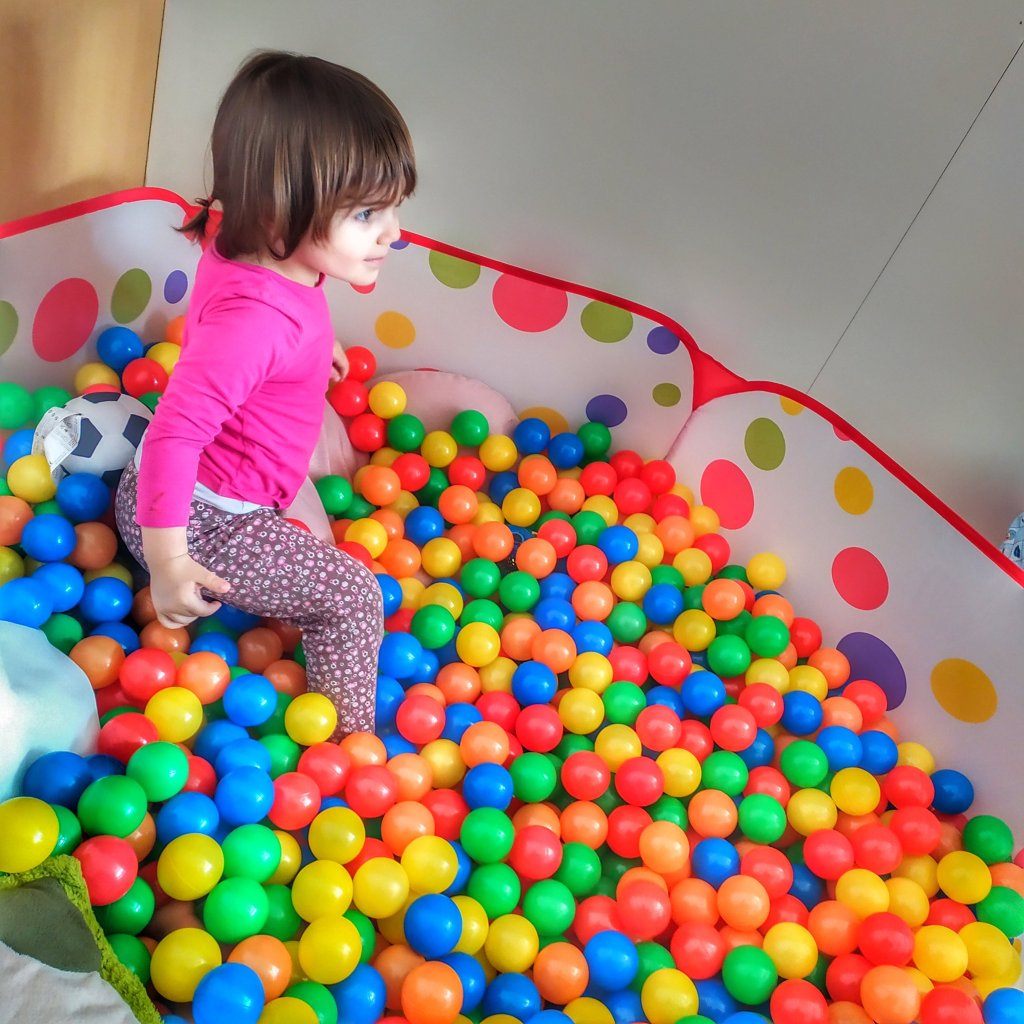 Descrizione immagine: la piccola Leila nella piscina di palline in casa